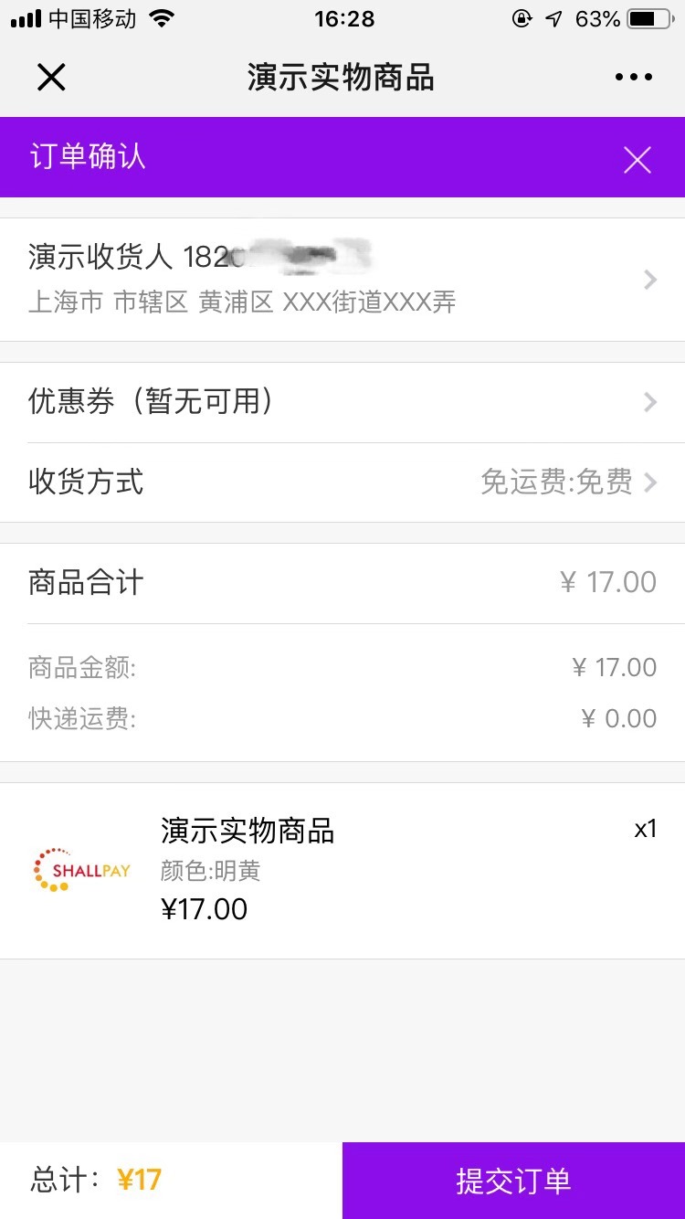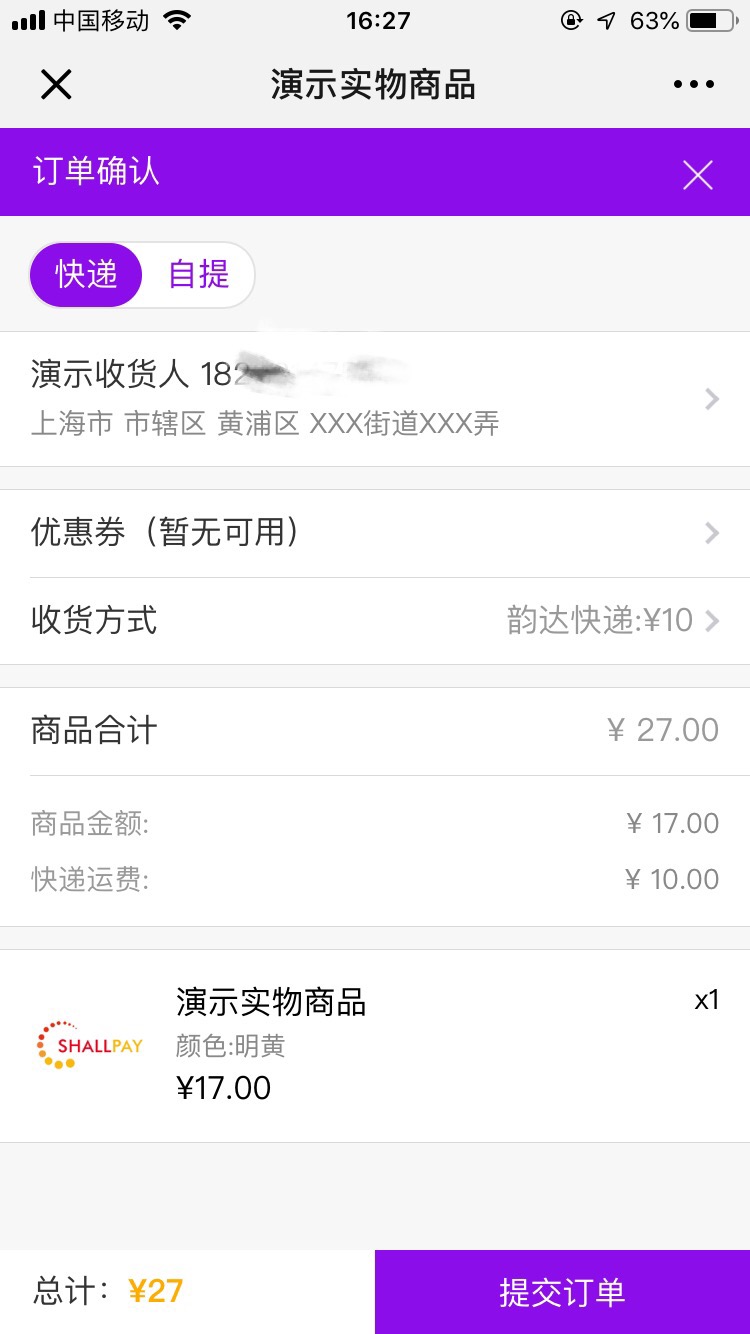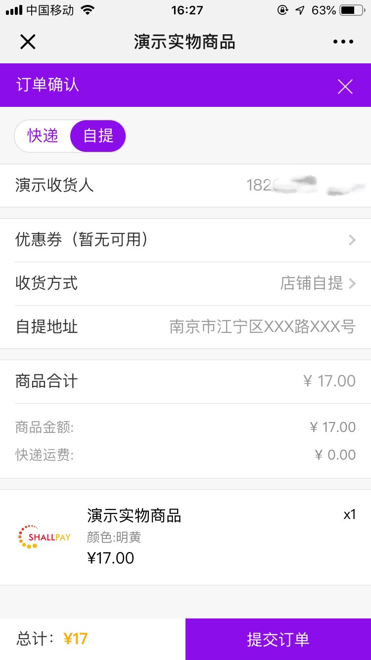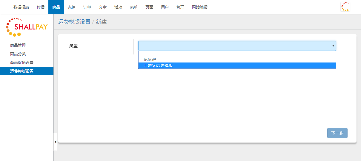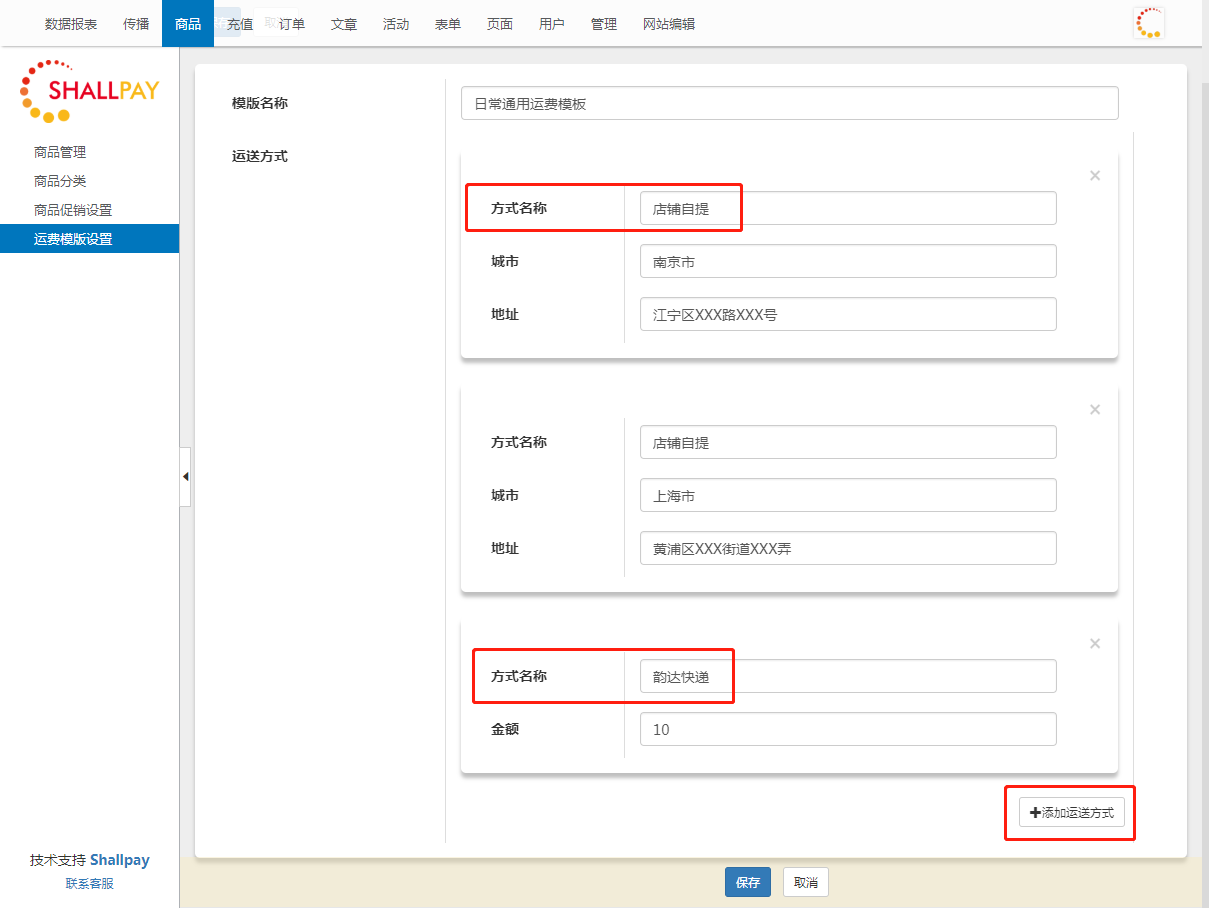 Shallpay微电商系统实物商品支持免运费、固定运费和自提三种运费模板设置。