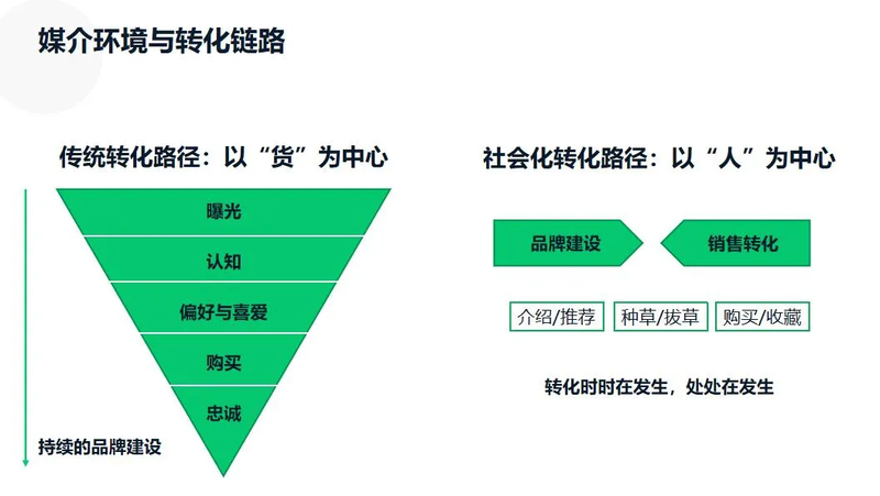 现在 社会化的转化路径是以人为中心,无论是品牌建设还是销售转化,都是围绕人去做更多的介绍、种草、购买等,转化是时时在发生,处处在发生,更像是一种涟漪式的转化模式。